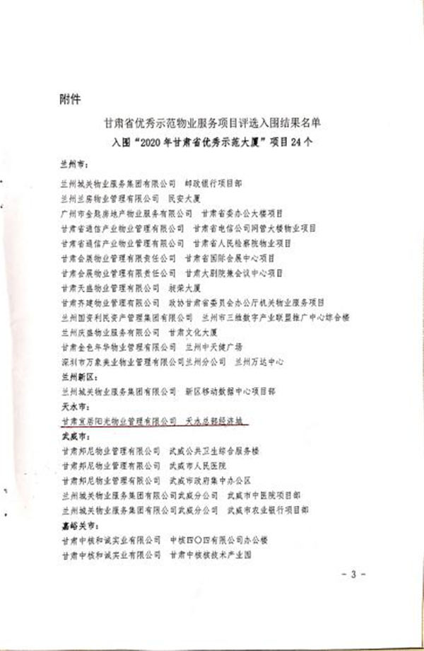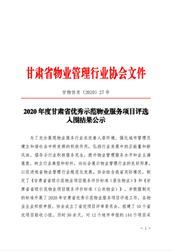 近日,天水上尚宅項(xiàng)目獲2020年度“甘肅省物業(yè)管理優(yōu)秀示范項(xiàng)目”,總部經(jīng)濟(jì)城獲2020年度“甘肅省物業(yè)管理優(yōu)秀示范大廈”。本次評(píng)選活動(dòng)由12個(gè)地市申報(bào)的144個(gè)項(xiàng)目參與,評(píng)審委員會(huì)采取聽(tīng)、看、談、訪、查等多種方式,對(duì)標(biāo)對(duì)表對(duì)參選項(xiàng)目進(jìn)行評(píng)選,歷時(shí)30余天,最終確定評(píng)選結(jié)果。