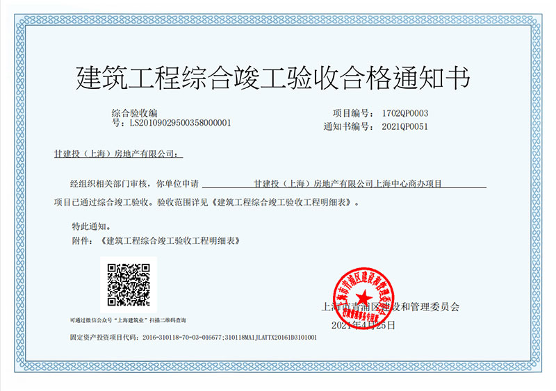 4月25日,甘建投商務(wù)廣場(chǎng)項(xiàng)目順利取得《建設(shè)工程竣驗(yàn)收備案證明》。本次備案是在上海市青浦區(qū)建設(shè)和管理委員會(huì)的嚴(yán)格督導(dǎo)下,按照備案程序,依法依規(guī)辦理。
