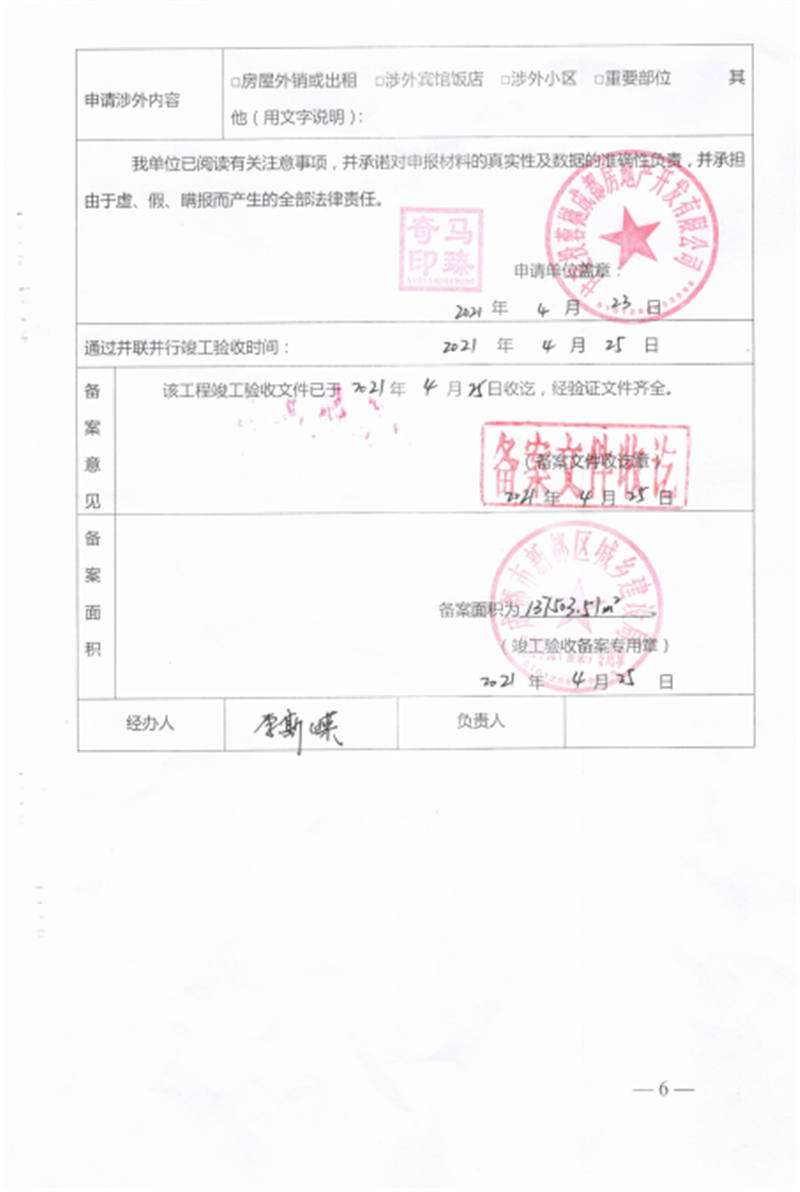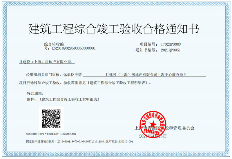 4月25日,成都百酈錦城、上海甘建投商務(wù)廣場(chǎng)項(xiàng)目程工取得《建筑工程綜合竣工驗(yàn)收合格通知書》標(biāo)志著項(xiàng)目已正式完成竣工驗(yàn)收,全面進(jìn)入交付階段。