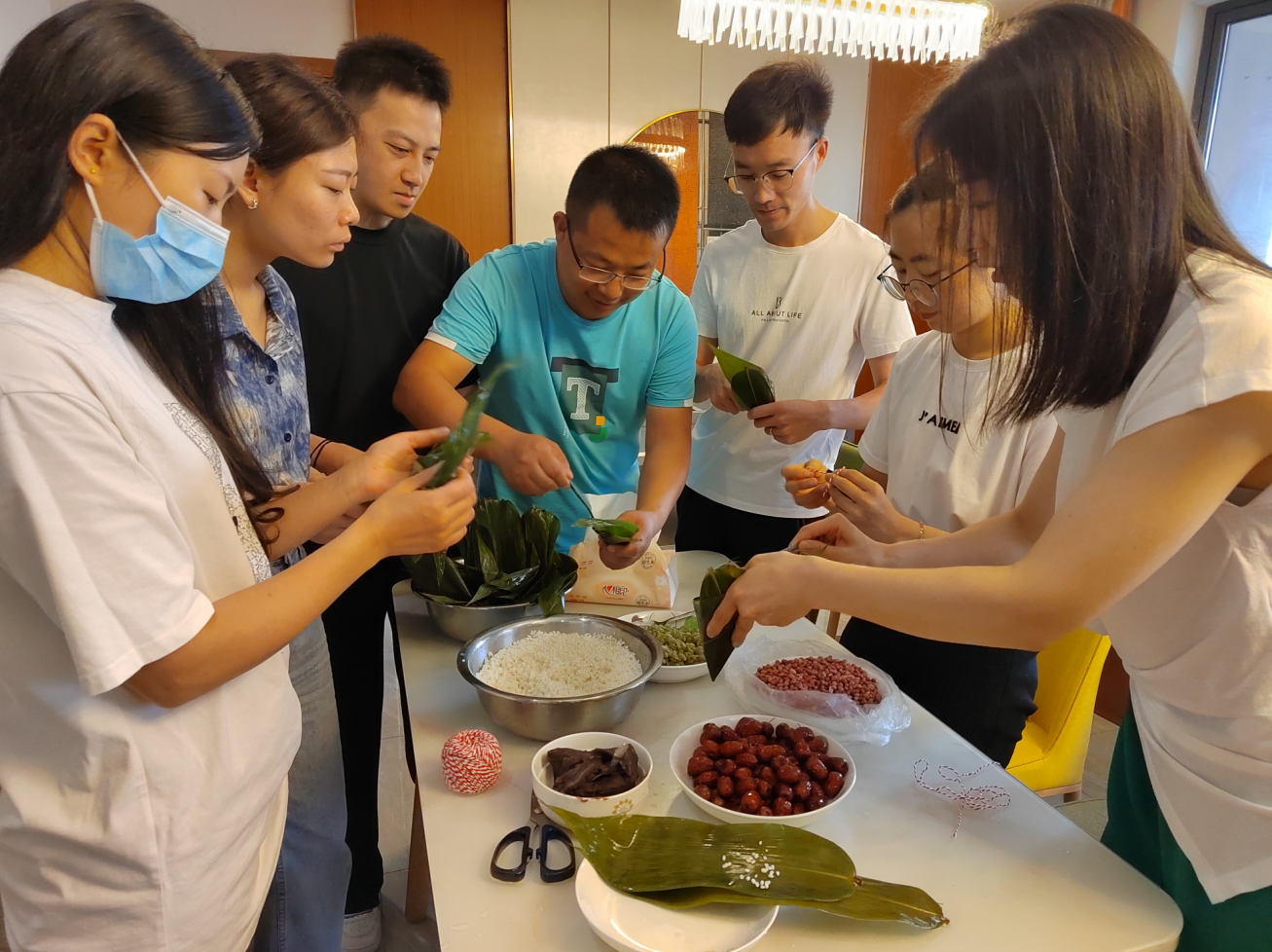成都公司早早為大家準(zhǔn)備好了粽葉、糯米、大棗、紅豆、葡萄干等材料,成都公司全體職工在一起用著不同的方法包著粽子,現(xiàn)場(chǎng)歡聲笑語、其樂融融,洋溢著端午節(jié)的熱鬧氣氛。卷葉、裹線、綁繩,大家忙得不亦樂乎,展示著自己的拿手技術(shù),三角粽,四角粽,牛角粽各種各樣,甚是好看,很快一盆盆的粽子就出現(xiàn)在大家面前。