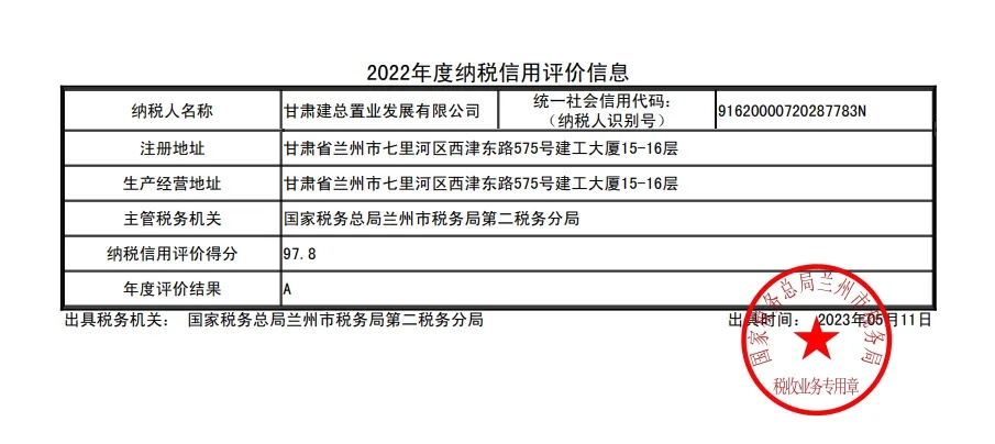 近日,在國(guó)家稅務(wù)總局甘肅省稅務(wù)局開展的2022年度納稅信用等級(jí)評(píng)定工作中,甘肅建總置業(yè)發(fā)展有限公司獲評(píng)“甘肅稅務(wù)系統(tǒng)納稅信用A級(jí)納稅人”榮譽(yù)稱號(hào)。此次獲評(píng)是置業(yè)公司首次榮獲該榮譽(yù)稱號(hào),為公司融資、審計(jì)等業(yè)務(wù)提供了良好的信譽(yù)保證,進(jìn)一步提升了企業(yè)軟實(shí)力。
